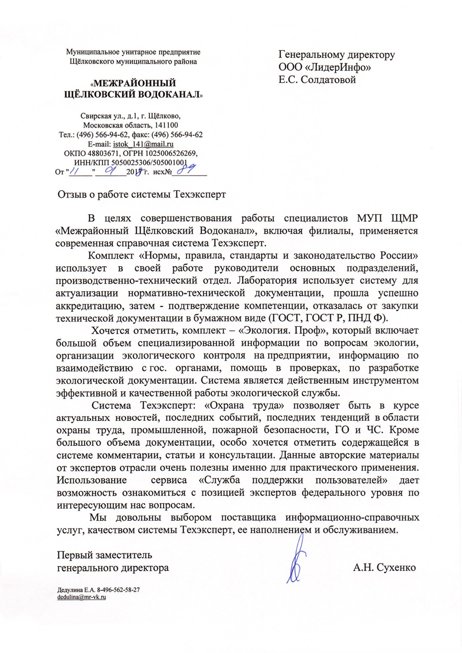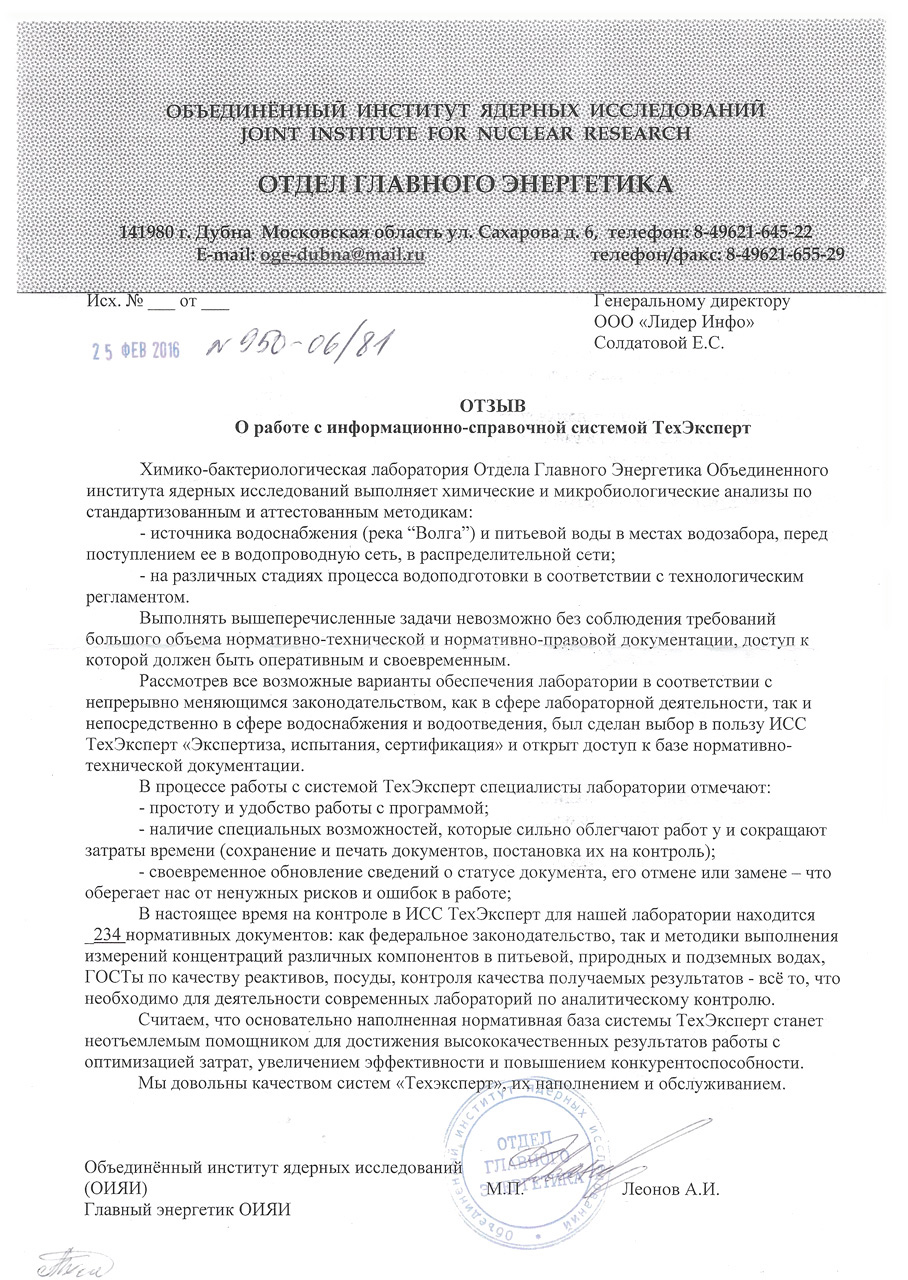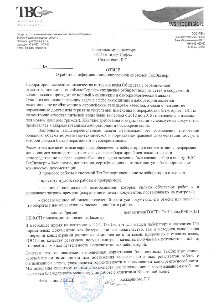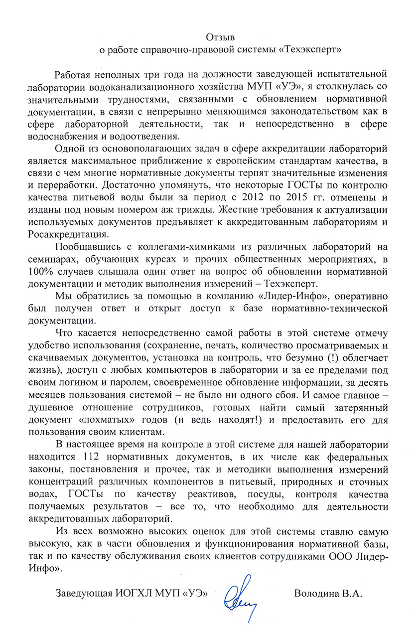 Пообщавшись с коллегами-химиками из различных лабораторий на семинарах, обучающих курсах и прочих общественных мероприятиях, в 100% случаев слышала один ответ на вопрос об обновлении нормативной документации и методики выполнения измерений - Техэксперт. Мы обратились за помощью в компанию «Лидер-Инфо», оперативно был получен ответ и открыт доступ к базе нормативно-технической документации. Что касается непосредственно самой работы в этой системе, отмечу удобство использования (сохранение, печать, количество просматриваемых и скачиваемых документов, установка на контроль, что безумно (!) облегчает жизнь), доступ с любых компьютеров в лаборатории и за ее пределами под своим логином и паролем, своевременное обновление информации, за десять месяцев пользования системой не было ни одного сбоя. И самое главное - душевное отношение сотрудников, готовых найти самый затерянный документ «лохматых» годов (и ведь находят!) и предоставить его для пользования своим клиентам. В настоящее время на контроле в этой системе для нашей лаборатории находится 112 нормативных документов, в их числе как федеральные законы, постановления и прочее, так и методики выполнения измерений концентраций различных компонентов в питьевых, природных и сточных водах, ГОСТы по качеству реактивов, посуды, контроля качества получаемых результатов - все то, что необходимо для деятельности аккредитованных лабораторий. Из всех возможных оценок для этой системы ставлю самую высокую, как в части обновления и функционирования нормативной базы, так и по качеству обслуживания своих клиентов сотрудниками ООО «Лидер-Инфо».