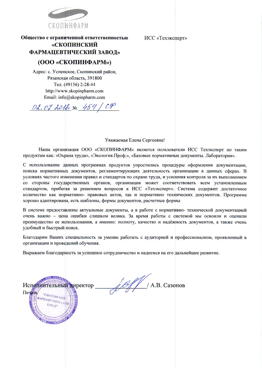 С использованием данных программных продуктов упростились процедуры оформления документации, поиска нормативных документов, регламентирующих деятельность организации в данных сферах. В условиях частого изменения правил и стандартов по охране труда и усиления контроля за их выполнением со стороны государственных органов, организация может соответствовать всем установленным стандартам, прибегая за решением вопросов к ИСС «Техэксперт». Система содержит достаточное количество как нормативно-правовых актов, так и нормативно-технических документов. Программа хорошо адаптирована, есть шаблоны документов, расчетные формы. В системе предоставлены актуальные документы, а в работе с нормативно-технической документацией очень важно - цена ошибки слишком велика. За время работы с системой мы освоили и оценили преимущество ее использования, а именно: полноту, качество и надежность документов, а также очень удобный и быстрый поиск. Благодарим ваших специалистов за умение работать с аудиторией и профессионализм, проявленный в организации и проведении обучения. Выражаем благодарность за успешное сотрудничество и надеемся на его дальнейшее развитие.